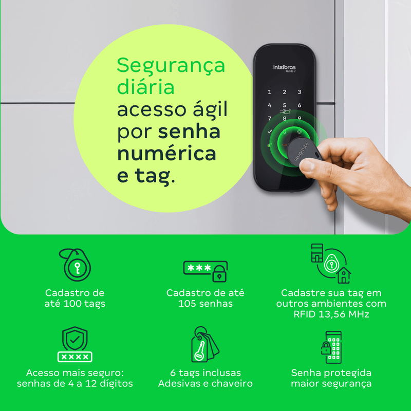 Características técnicas | > Cadastro de até 105 senhas, sendo 1 de administrador, 4 de visitante e 100 de usuário.